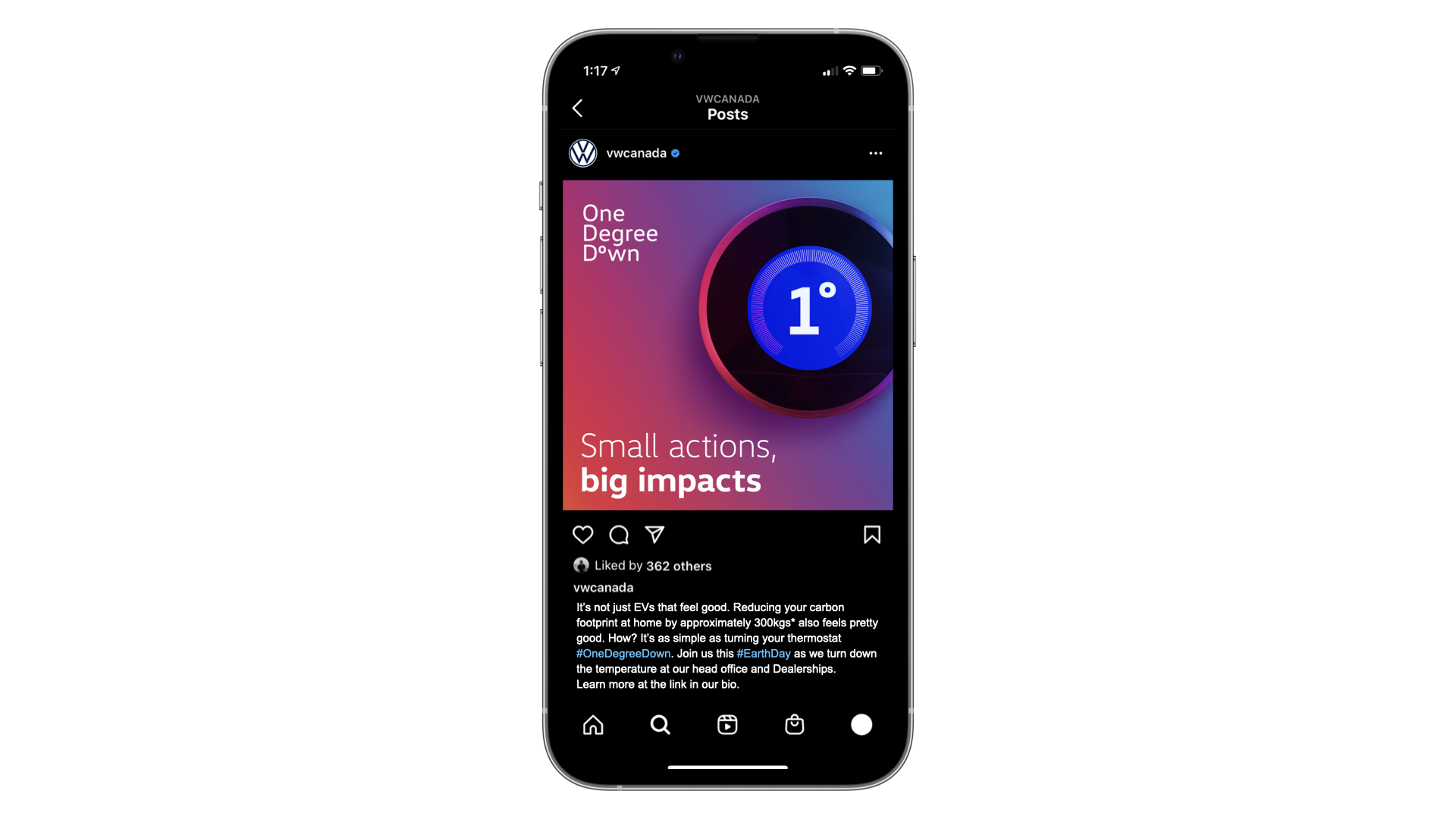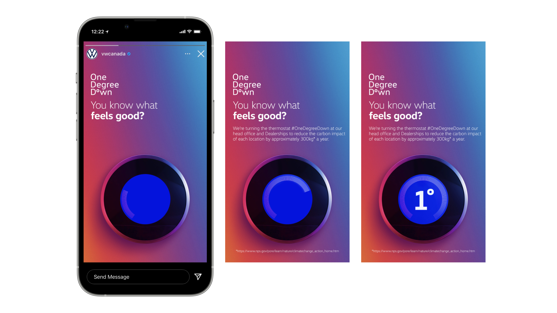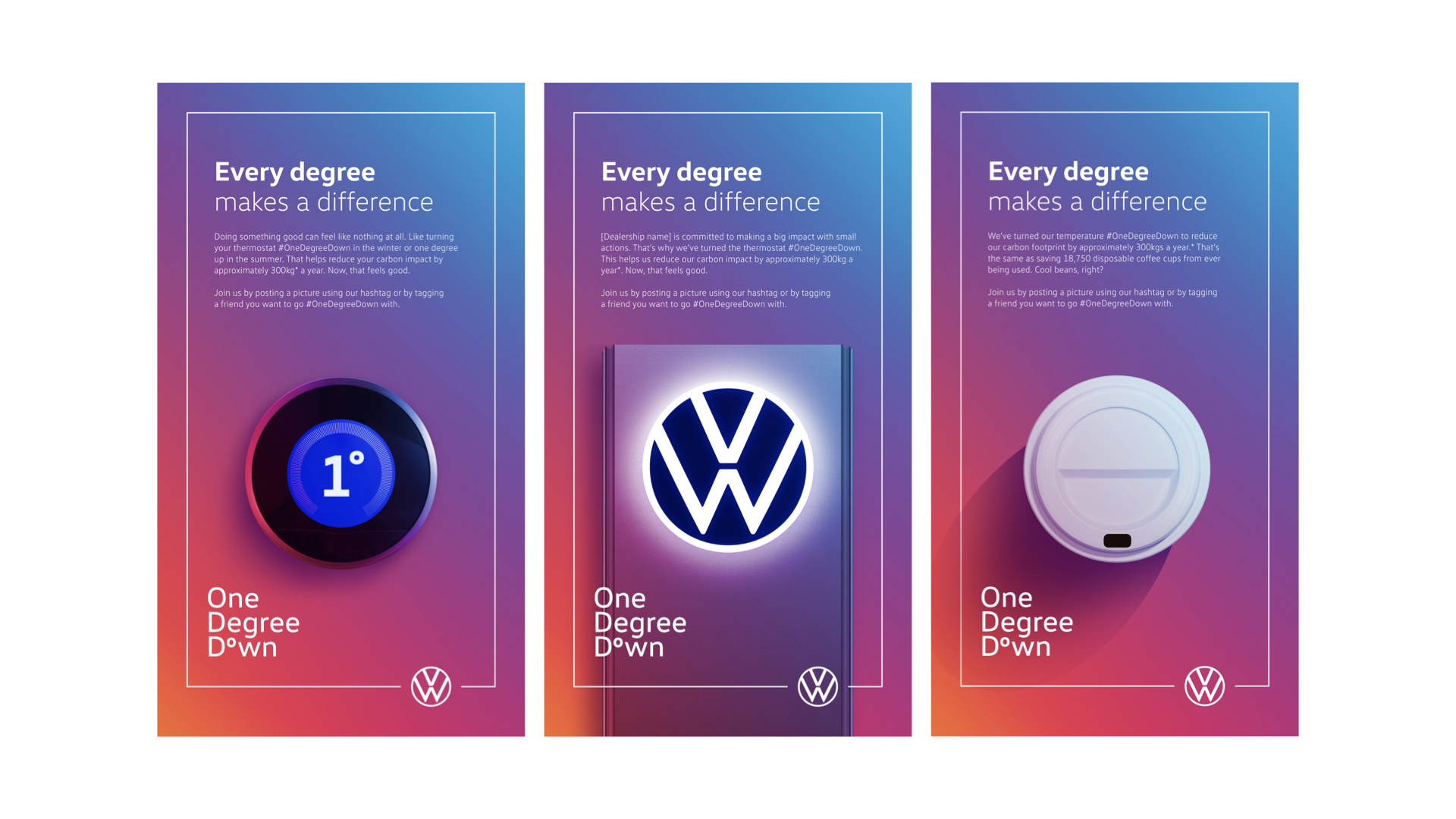Every degree makes a difference. So, we’re going to turn the thermostat One Degree Down, at VW offices, home offices, and Dealerships, and then challenge Canadians to do the same at home..